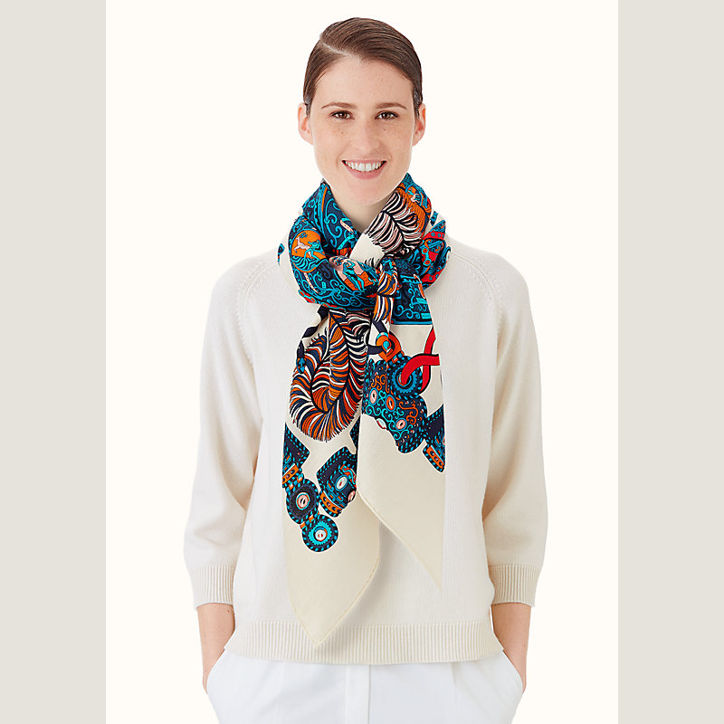 Preserve the beauty of your scarf by avoiding contact with rain, water and other chemicals. Store it flat and untied, and entrust it to a professional dry cleaner when needed.