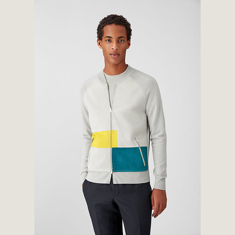 Super 160 fine wool and velvet goatskin zippered jacket, two-way zip, zip pockets (100% super 160 fine wool sleeves and back, 100% velvet goatskin front).